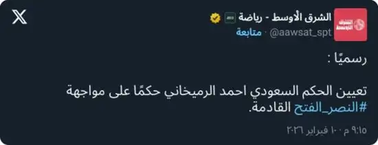 أعلنت لجنة الحكام في الاتحاد السعودي لكرة القدم تعيين الحكم السعودي أحمد الرميخاني لإدارة مواجهة نادي النصر أمام الفتح، ضمن الجولة الـ22 من دوري روشن السعودي للمحترفين.