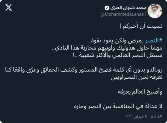 وتابع في تغريدته: «رونالدو بدون أي كلمة فضح المستور وكشف الحقائق وعرّى واقعًا كنا نعرفه نحن النصراويين، وأصبح العالم يعرفه، لا عدالة في المنافسة بين النصر وجاره»، في إشارة غير مباشرة إلى نادي الهلال، ما أثار تفاعلًا واسعًا بين جماهير الناديين.