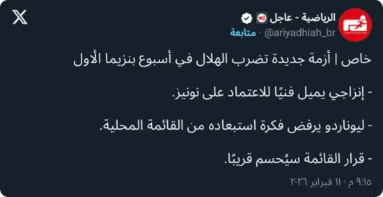 وفي تطور مفاجئ، فقد استقر الجهاز الفني بقيادة سيموني إنزاجي بشكل رسمي على استبعاد داروين نونيز من القائمة المحلية، عقب مشاورات داخلية بين الجهازين الفني والإداري.