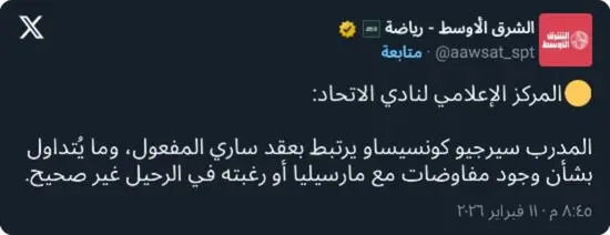 وفي هذا السياق، أكدت إدارة الاتحاد أن ما يُتداول بشأن رحيل كونسيساو غير صحيح، مشددة على أن المدرب مستمر في منصبه، ويركز بشكل كامل على تحضيرات الفريق للاستحقاقات المقبلة.