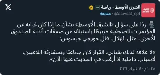 وعن هذا الجدل، رد جيسوس على سؤال بشأن ما إذا كان غيابه احتجاجًا على صفقات الأندية المنافسة، قائلاً: «لا علاقة لذلك بغيابي… القرار لم يكن فرديًا، بل جاء بشكل جماعي، بمشاركة اللاعبين، لأسباب داخلية لا أرغب في الحديث عنها الآن، ولا علاقة لصفقات أي نادٍ منافس لنا بهذا الأمر».