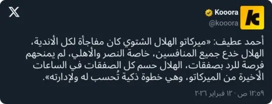 وأضاف: «ميركاتو الهلال الشتوي كان مفاجأة لكل الأندية، الهلال خدع جميع المنافسين، خاصة النصر والأهلي، لم يمنحهم فرصة للرد بصفقات، الهلال حسم كل الصفقات في الساعات الأخيرة من الميركاتو، وهي خطوة ذكية تُحسب له ولإدارته»..