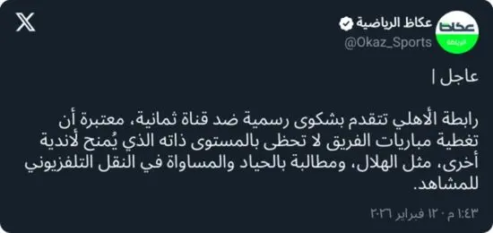 أصدرت رابطة مشجعي النادي الأهلي بيانًا رسميًا أعلنت فيه تقديم شكوى إلى الجهات المختصة، بشأن ما وصفته بعدم رضاها عن آلية تغطية مباريات الفريق من قبل قناة ثمانية، الناقل الرسمي لمنافسات دوري روشن السعودي.