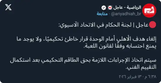 وفي تطور لافت، أقرت لجنة الحكام في الاتحاد الآسيوي لكرة القدم، عقب مراجعتها الرسمية للحالة، بأن قرار إلغاء الهدف كان خاطئًا من الناحية التحكيمية، مؤكدة أنه لا يوجد ما يمنع احتساب الهدف وفقًا لتطبيق نصوص قانون اللعبة، وأن الاحتكاك الذي سبق تسجيل الكرة لا يرقى إلى مستوى المخالفة المؤثرة.