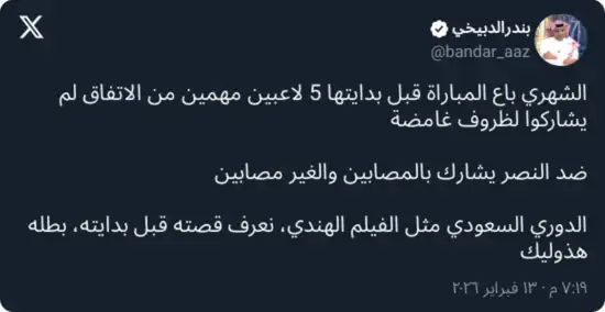 ي سبحان الله يدين نفسه من حيث لا يعلم يقول امام النصر يشارك بالمصابين يعني إنه معطي النصر الضوء الأخضر للفوز لكن الخبل يبقى خبل 😝