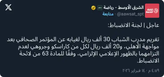 وبحسب ما نصّت عليه المادة 63 من لائحة الانضباط والأخلاق، تقرر تغريم مدرب الشباب مبلغ 30 ألف ريال سعودي لغيابه دون تقديم عذر مقبول، كما فُرضت غرامة مالية قدرها 20 ألف ريال على كل من يانيك كاراسكو ومارسيلو جروهي، لعدم التزامهما بالظهور الإعلامي الإلزامي.