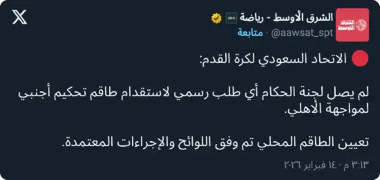 وفي بيان توضيحي، أكدت لجنة الحكام بالاتحاد السعودي لكرة القدم أنها لم تتلقَّ أي طلب رسمي من نادي الشباب لاستقدام طاقم تحكيم أجنبي لتلك المباراة، موضحة أن جميع الطلبات يجب أن تُرفع عبر القنوات النظامية المعتمدة وضمن المدد الزمنية المحددة في اللوائح.