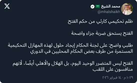 وفي هذا السياق، قال الشيخ عبر حسابه الرسمي: “ظلم تحكيمي كارثي من حكم مباراة النصر والفتح”، معتبرًا أن بعض القرارات كان لها تأثير مباشر على مجريات المواجهة.