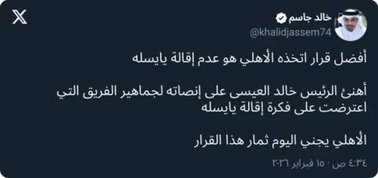 وأضاف: “أهنئ الرئيس خالد العيسى على إنصاته لجماهير الفريق التي اعترضت على فكرة إقالة يايسله، الأهلي يجني اليوم ثمار هذا القرار”، مشددًا على أن الاستقرار الفني كان عنصرًا حاسمًا في استعادة الفريق لتوازنه وتحقيق نتائج إيجابية.