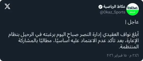 ويعيش النصر فترة حساسة من الموسم، في ظل سعيه للمنافسة بقوة على لقب دوري روشن السعودي، وعدم التفريط بأي نقطة في سباق التتويج، أملًا في إنهاء صيام دام ستة أعوام عن منصة الدوري، وهو ما يجعل أي تحرك إداري أو فني محل متابعة دقيقة.