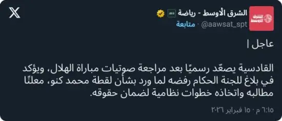 كما طالبت إدارة القادسية بعدم تكليف الحكم ذاته بإدارة أي مباراة للفريق مستقبلًا في دوري روشن السعودي، إلى حين الانتهاء من مراجعة الواقعة بشكل كامل، مؤكدة احتفاظها بحقها في اتخاذ كافة الإجراءات النظامية التي تكفل صون حقوق النادي وتعزيز نزاهة المسابقة.