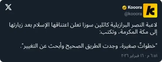 أعلنت لاعبة فريق سيدات نادي النصر، البرازيلية كاثلين سوزا، اعتناقها الإسلام، في خطوة لاقت تفاعلًا واسعًا داخل الأوساط الرياضية، بعد نشرها صورًا من زيارتها إلى مكة المكرمة برفقة صديقاتها، معلقة: “خطواتٌ صغيرة، وجدت الطريق الصحيح وأبحث عن التغيير”.