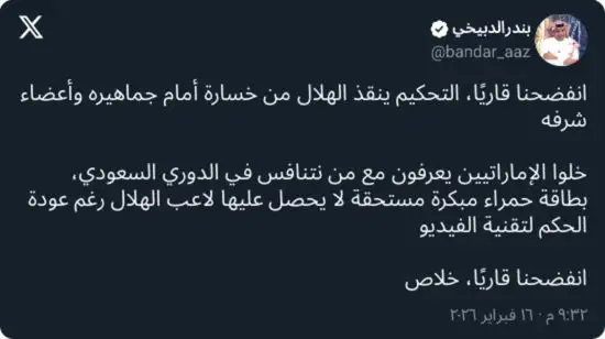 وفي أعقاب اللقاء، علّق الإعلامي الرياضي بندر الدبيخي بحدة عبر حسابه في منصة “إكس”، قائلاً: “انفضحنا قاريًا، التحكيم ينقذ الهلال من خسارة أمام جماهيره وأعضاء شرفه”.