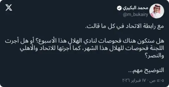 كما طرح الإعلامي محمد البكيري المعروف بميوله الاتحادية، تساؤلًا مماثلًا، داعيًا لجنة فحص المنشطات إلى توضيح آلية اختيار المباريات والأندية الخاضعة للفحص، ومطالبًا بإجراء الفحوصات على الهلال بالمعايير ذاتها التي طُبّقت على بقية الأندية، حفاظًا على مصداقية المنافسة.