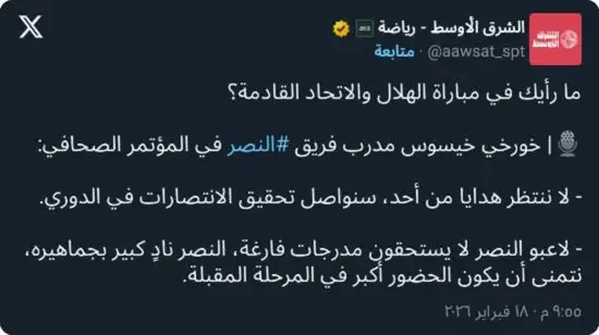 أبدى البرتغالي جورجي جيسوس، مدرب نادي النصر، استياءه من الأجواء الجماهيرية رغم فوز فريقه وتأهله إلى ربع نهائي دوري أبطال آسيا 2، مؤكدًا أن الدعم في المدرجات لا يقل أهمية عن الأداء داخل الملعب.