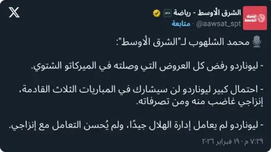وقال الشلهوب في تصريحات إعلامية: «ليوناردو لم يعامل إدارة الهلال جيدًا، ولم يُحسن التعامل مع إنزاجي»، في إشارة إلى توتر العلاقة بين اللاعب والجهاز الفني خلال المرحلة الماضية.