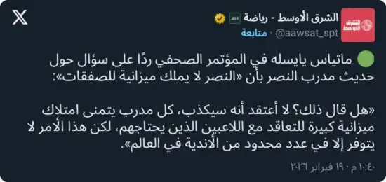 وردًا على سؤال أحد الصحفيين بشأن التصريحات المنسوبة لمدرب النصر، والتي أشار فيها إلى أن «النصر لا يمتلك أموالًا كافية لإبرام صفقات»، علّق يايسله قائلاً باستغراب: «هل قال ذلك؟ لا أعتقد أنه سيكذب، كل مدرب في العالم يتمنى امتلاك ميزانية كبيرة للتعاقد مع اللاعبين الذين يحتاجهم، لكن هذا الأمر لا يتوفر إلا في عدد قليل من الأندية في العالم».