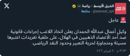 وأوضح الوكيل في بيان مقتضب أن الحمدان تعرّض لعبارات تتضمن إساءة وتشهيرًا وتقليلًا من مسيرته المهنية، مؤكدًا أن ما تم تداوله تجاوز حدود النقد الرياضي المباح وحرية التعبير إلى إساءات شخصية تمس سمعته واعتباره كلاعب محترف.
