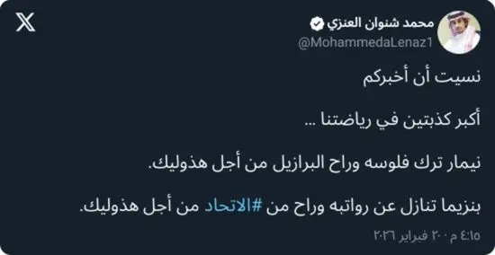 وفي سياق متصل، أثار الإعلامي محمد شنوان العنزي جدلًا واسعًا بعدما تحدث عن ما وصفه بـ”معلومتين غير دقيقتين” تم تداولهما في الوسط الرياضي خلال الموسمين الماضيين، وتتعلقان بملفي انتقال البرازيلي نيمار والفرنسي كريم بنزيما.