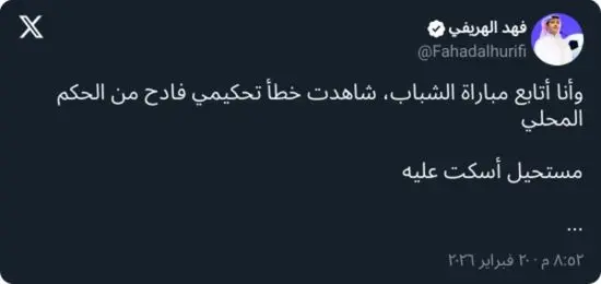 وفي هذا السياق، قال الهريفي في تصريح إعلامي: “وأنا أتابع مباراة الشباب، شاهدت خطأ تحكيميًا فادحًا من الحكم المحلي، مستحيل أن أسكت عليه”.