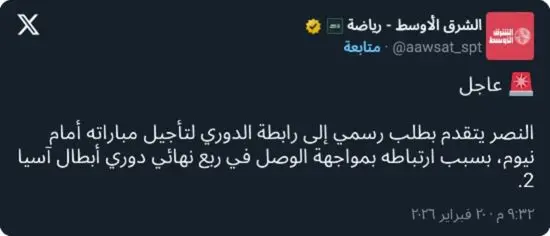 وفي ظل هذا البرنامج المكثف، وجّه النصر خطابًا رسميًا إلى رابطة الدوري السعودي للمحترفين، يطلب فيه تأجيل مباراته أمام نيوم، المقررة يوم 7 مارس ضمن منافسات الدوري، لإتاحة الفرصة أمام الفريق للتحضير الأمثل لمواجهة الإياب القارية وضمان الجاهزية الفنية والبدنية.