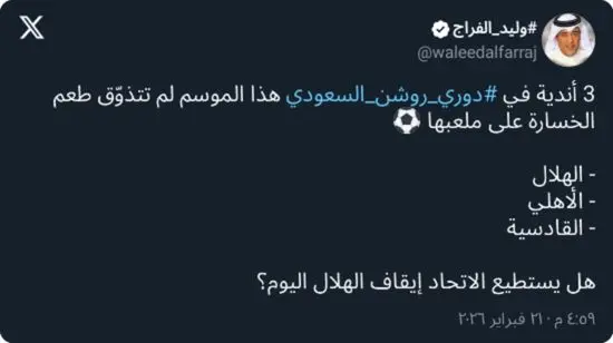 جدير بالذكر أن النصر والاتحاد، ورغم قوتهما الفنية هذا الموسم، تعرضا لهزائم على أرضهما، ما أخرجهما من قائمة الأندية التي حافظت على سجل خالٍ من الخسائر داخل الديار حتى هذه المرحلة من المنافسات.