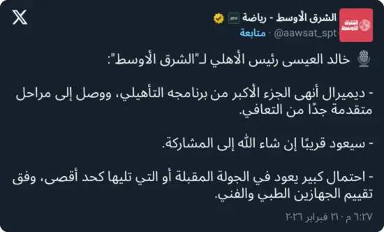 وكشف العيسى في تصريحات إعلامية أن المدافع التركي ميريح ديميرال اقترب من العودة الكاملة، مؤكدًا أن اللاعب أنهى الجزء الأكبر من برنامجه التأهيلي، ووصل إلى مراحل متقدمة جدًا من التعافي بعد الإصابة التي أبعدته مؤخرًا.