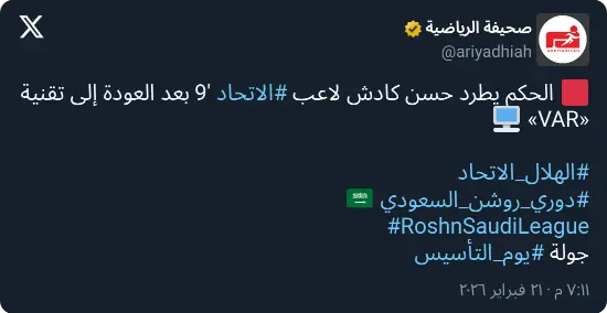 وكان الهلال قد افتتح التسجيل عبر البرازيلي مالكوم بعد خمس دقائق فقط، قبل أن تتعقد مهمة الاتحاد أكثر عند الدقيقة التاسعة، إثر تدخل كادش على مالكوم خارج منطقة الجزاء. الحكم أشهر البطاقة الصفراء في البداية، قبل أن يعود إلى تقنية الفيديو ويُعدل قراره إلى بطاقة حمراء مباشرة، في لقطة أثارت جدلاً واسعًا بين الجماهير.