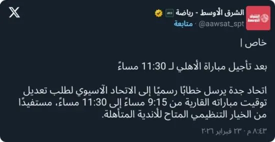 وبحسب معلومات خاصة، أرسل اتحاد جدة قبل لحظات خطابًا رسميًا إلى الاتحاد الآسيوي لكرة القدم يطلب فيه تعديل موعد مباراته من الساعة 9:15 مساءً إلى 11:30 مساءً بتوقيت مكة المكرمة، استنادًا إلى اعتبارات تنظيمية تتعلق بظروف إقامة اللقاء.