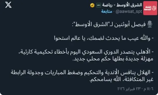 وتابع: “الأهلي يتصدر الدوري السعودي اليوم بأخطاء تحكيمية كارثية، مهزلة جديدة بطلها حكم محلي جديد”، في تصريحات حملت نبرة استياء واضحة مما وصفه بأخطاء مؤثرة في نتيجة المباراة.