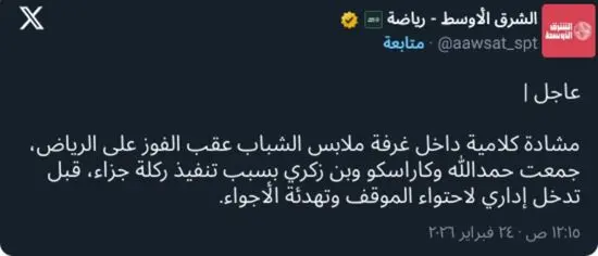 وجاء التوتر بعد المباراة التي حسمها الشباب بثلاثية، في ظل حالة تنافس داخل الفريق بشأن تنفيذ ركلات الجزاء، وهو ما امتد إلى ما بعد صافرة النهاية داخل غرفة الملابس.