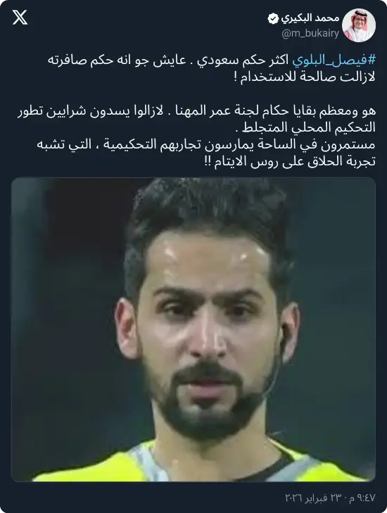 وفي السياق ذاته، طالب الإعلامي محمد البكيري لجنة الحكام باتخاذ إجراء تجاه الحكم فيصل البلوي، معتبرًا أن الأخطاء التحكيمية تكررت خلال الموسم، داعيًا إلى إيقافه عن إدارة المباريات المقبلة.