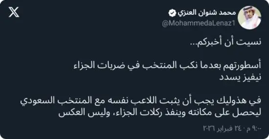 وأثار مشهد التنفيذ جدلًا إعلاميًا، حيث علق الإعلامي محمد شنوان العنزي مستنكرًا غياب الدوسري عن تسديد الركلة، متسائلًا: “نسيت أن أخبركم، أسطورهم بعدما نكب منتخبا في ضربات الجزاء، نيفيز يسدد”.