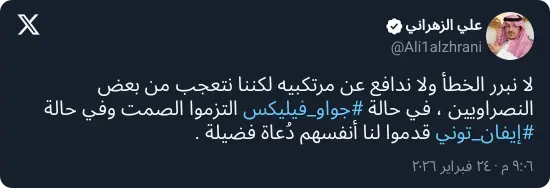 وفي هذا السياق، قال الزهراني، المعروف بميوله الأهلاوية، عبر حسابه الشخصي: “لا نبرر الخطأ ولا ندافع عن مرتكبيه، لكنني شخصيًا أتعجب من بعض النصراويين”.