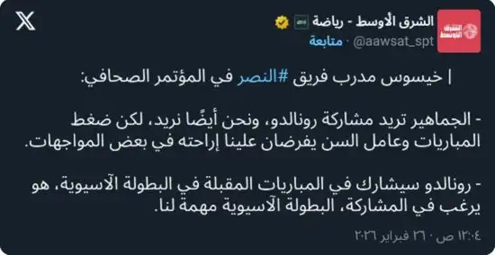 وعن مشاركة كريستيانو رونالدو في دوري أبطال آسيا 2، قال المدرب البرتغالي: “الجماهير تريد مشاركته، ونحن أيضًا نريد ذلك، لكن ضغط المباريات وعامل السن يفرضان علينا إراحته في بعض المواجهات، لكن رونالدو سيشارك في المباريات المقبلة كلها، هو يرغب في اللعب، البطولة الآسيوية مهمة لنا ونريد المنافسة عليها بقوة”.