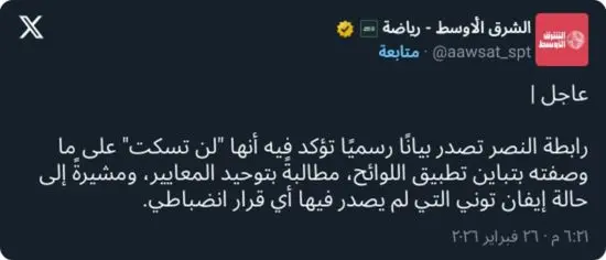 وشددت الرابطة في ختام بيانها على ضرورة تعزيز الشفافية في القرارات الانضباطية، مؤكدة أن حماية نزاهة المنافسة تقتضي وضوحًا كاملاً في التعامل مع جميع الحالات، خصوصًا في مرحلة لا تحتمل أي لبس أو تضارب في تطبيق الأنظمة.