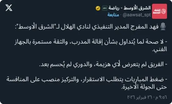 حسم المدير التنفيذي لكرة القدم بنادي الهلال فهد المفرج الجدل الدائر حول مستقبل الجهاز الفني، كاشفًا موقف النادي الرسمي من الأنباء التي ترددت خلال الساعات الماضية بشأن إقالة المدرب، في ظل تصاعد النقاش الجماهيري مع اقتراب الموسم من مراحله الحاسمة.