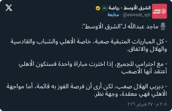 حدّد أسطورة النصر ماجد عبدالله هوية أصعب مباراة متبقية لفريقه في دوري روشن السعودي، مع اقتراب الموسم من مراحله الحاسمة واحتدام الصراع على اللقب.