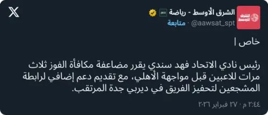 وفي هذا السياق، كشفت مصادر خاصة أن رئيس النادي فهد سندي أبلغ لاعبي الفريق بمضاعفة مكافأة الفوز ثلاث مرات حال تحقيق الانتصار في الديربي المرتقب، في خطوة لتحفيز اللاعبين قبل القمة.