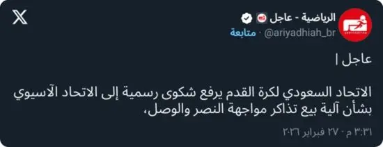 وفي هذا السياق، كشفت مصادر مطلعة أن الاتحاد السعودي لكرة القدم برئاسة ياسر المسحل تقدم بشكوى رسمية عاجلة إلى الاتحاد الآسيوي لكرة القدم، مطالبًا بمراجعة آلية بيع التذاكر وضمان تطبيق اللوائح المنظمة لمباريات الأندية، بما يحفظ حقوق جماهير النصر ويكفل مبدأ تكافؤ الفرص.