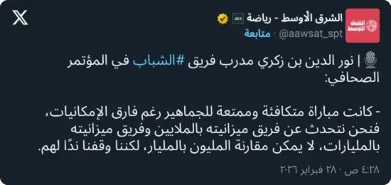 وأضاف: “أنا سعيد بالمستوى الذي قدمه اللاعبون، كانت مباراة متكافئة وممتعة للجماهير رغم فارق الإمكانيات، فنحن نتحدث عن فريق ميزانيته بالملايين وفريق ميزانيته بالمليارات، لا يمكن مقارنة المليون بالمليار، لكننا وقفنا ندًا لهم”.