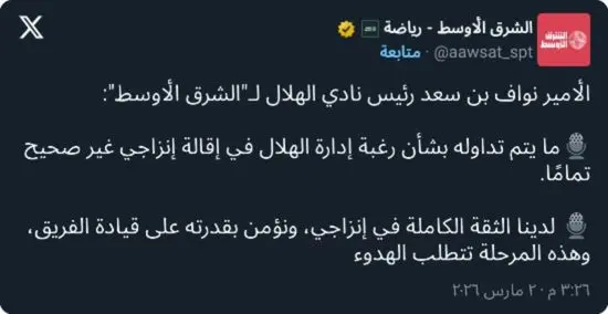 وفي هذا السياق، أكد نواف بن سعد في تصريحات لصحيفة الشرق الأوسط أن “ما يتم تداوله بشأن إقالة إنزاجي غير صحيح تمامًا”، مشددًا على استمرار المدرب في منصبه.