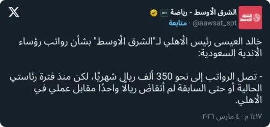 وفي هذا السياق، أكد العيسى أن رواتب رؤساء الأندية الكبرى قد تصل إلى نحو 350 ألف ريال شهريًا، في ظل التحولات الإدارية التي شهدتها الأندية بعد خصخصتها وتحويلها إلى شركات رياضية.