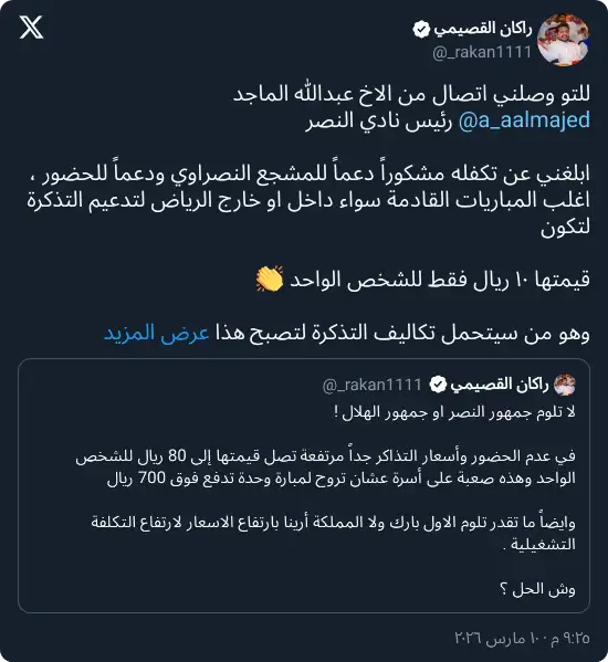 وفي هذا السياق، تكفّل رئيس نادي النصر عبدالله الماجد بدعم المشجع النصراوي عبر تحمل الجزء الأكبر من قيمة تذاكر أغلب مباريات الفريق المقبلة، سواء داخل الرياض أو خارجها، لتصبح قيمة التذكرة 10 ريالات فقط للمشجع الواحد، في خطوة لاقت صدى واسعًا بين الجماهير.