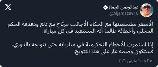وفي هذا السياق، استنكر الإعلامي عبدالرحمن الجماز إسناد المباراة إلى طاقم محلي، معتبرًا أن النصر لا يبدو منزعجًا من هذا الخيار طالما أن أخطاء الحكم المحلي، بحسب رأيه، تصب في مصلحته.