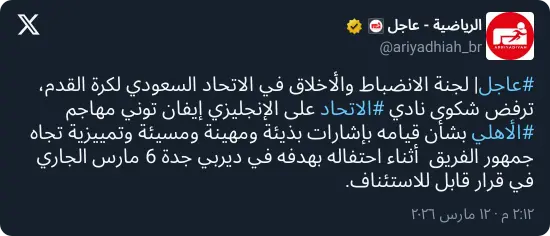 أغلقت لجنة الانضباط والأخلاق في الاتحاد السعودي لكرة القدم ملف الشكوى المقدمة ضد الإنجليزي إيفان توني، مهاجم الأهلي، بعدما قررت قبولها شكليًا ورفضها موضوعيًا، لتنتهي بذلك حالة الجدل التي تصاعدت خلال الساعات الماضية حول احتفاليته أمام مدرجات الاتحاد في ديربي جدة.