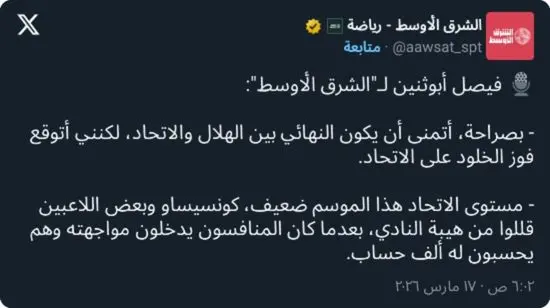 وفي هذا السياق، قدّم فيصل أبوثنين رؤيته للمواجهة بتصريحات مباشرة، مؤكدًا: “بصراحة، أتمنى أن يكون النهائي بين الهلال والاتحاد، لكنني أتوقع فوز الخلود على الاتحاد”.